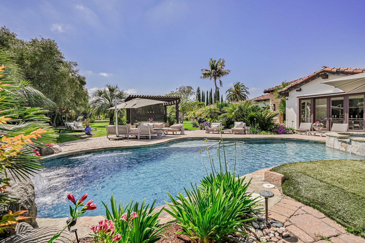 Welcome to your own private paradise nestled in the exclusive, guard-gated enclave of The River Estates; a prestigious community of just 14 luxury residences in Rancho Santa Fe. Beyond its impressive entrance, this meticulously crafted single-story estate sits on resort-style grounds, offering the ultimate Southern California lifestyle. This custom-designed 5-bed, 4-bath estate--including a detached "guest" house --seamlessly blends luxury, comfort and modern elegance. The main residence (4 bd, 3 ba) emphasizes indoor/outdoor living, with a fresh modern Tuscan vibe and stunning craftsmanship throughout. Step outside into a lush, private oasis designed for entertainment and tranquility alike. The expansive grounds feature: A resort-style pool and spa with cascading waterfall, Loggia and covered veranda for al fresco dining, Summer kitchen with built-in BBQ & authentic Italian stone pizza oven, Basketball half court, 7-hole putting green, bocce ball, horseshoe pit, and rolling green lawns, serene koi pond and outdoor fireplace, ideal for meditation or entertaining, abundant seating areas thoughtfully arranged for your enjoyment, several fountains and water elements, evoking a tranquil, resort-like feel, multiple outdoor storage options throughout the property. Surrounded by mature palms and vibrant flora, this estate offers a rare level of privacy, exclusivity, and resort-like amenities. It's perfectly located just minutes from the Rancho Santa Fe Village, award-winning schools, equestrian facilities, shopping, dining, & freeway access.